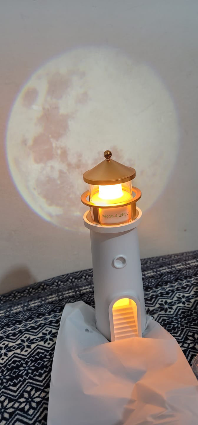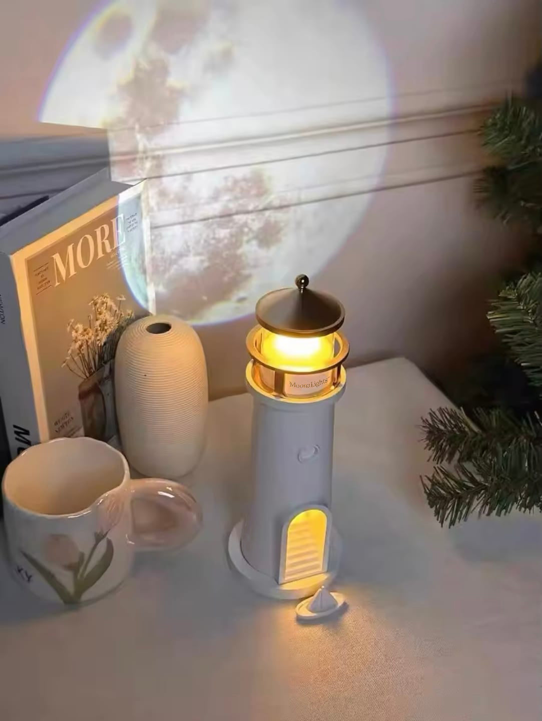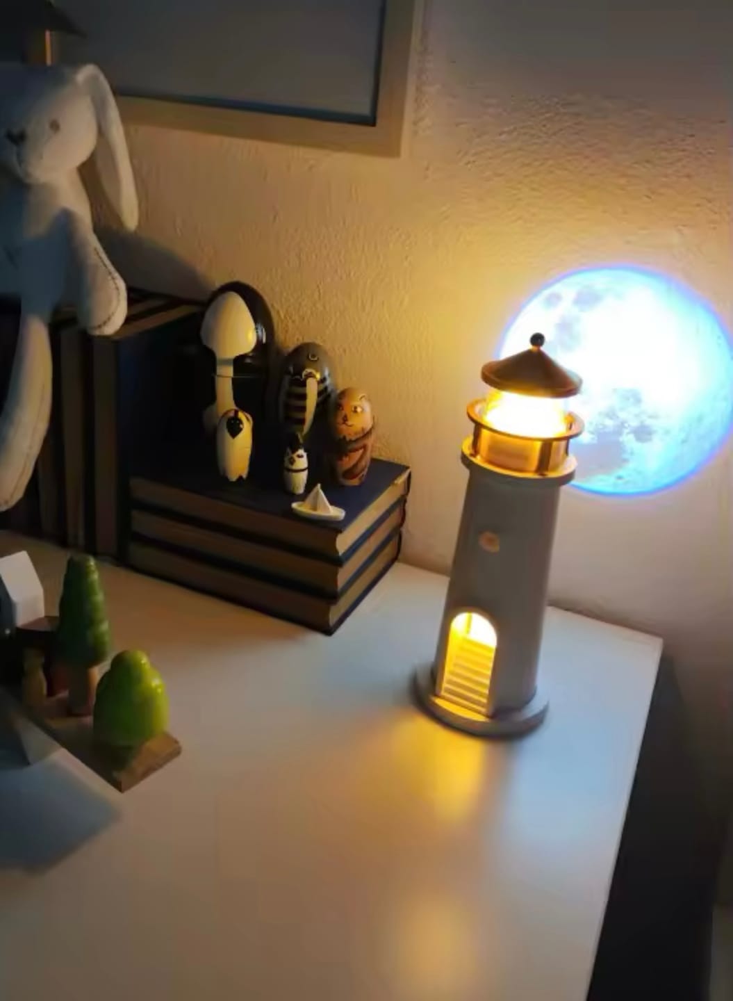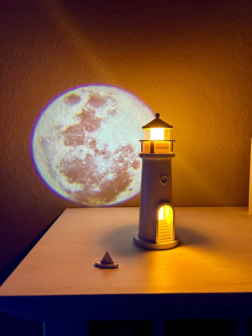 Inside, you’ll find the Lighthouse Moon Projector, USB-C charging, a decorative stand, a small sailboat, a clear guide, and a remote. Everything is designed to create a cozy, magical moonlight experience in your room.