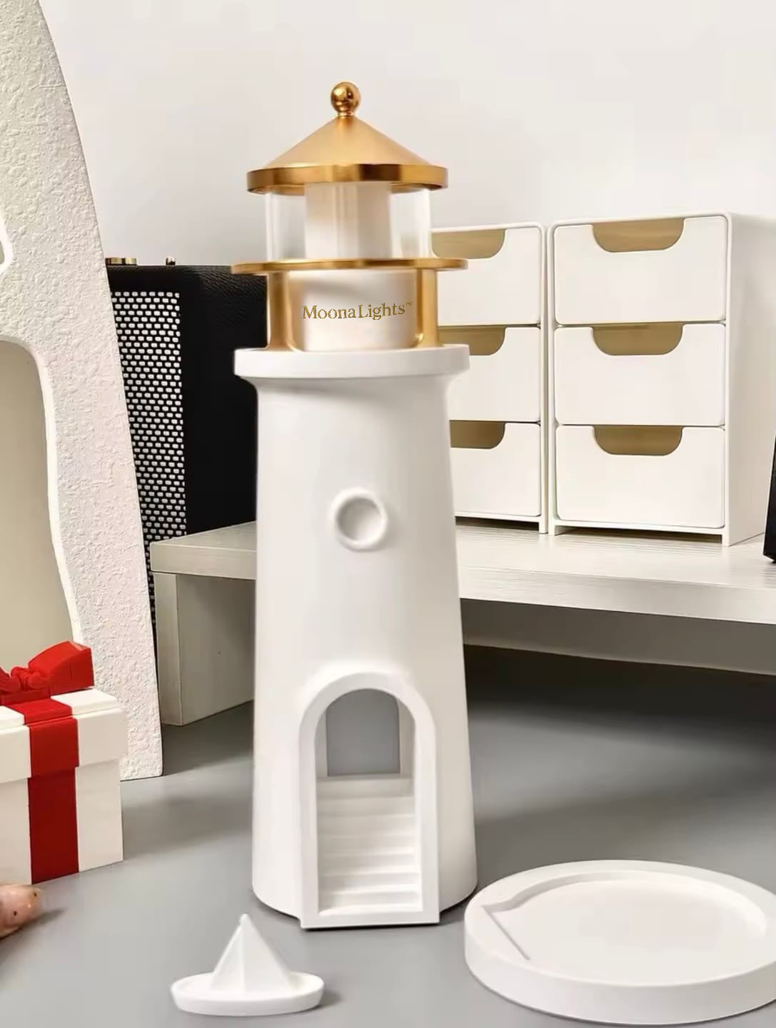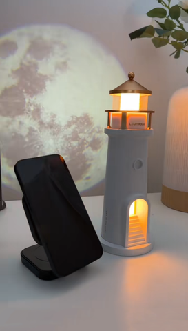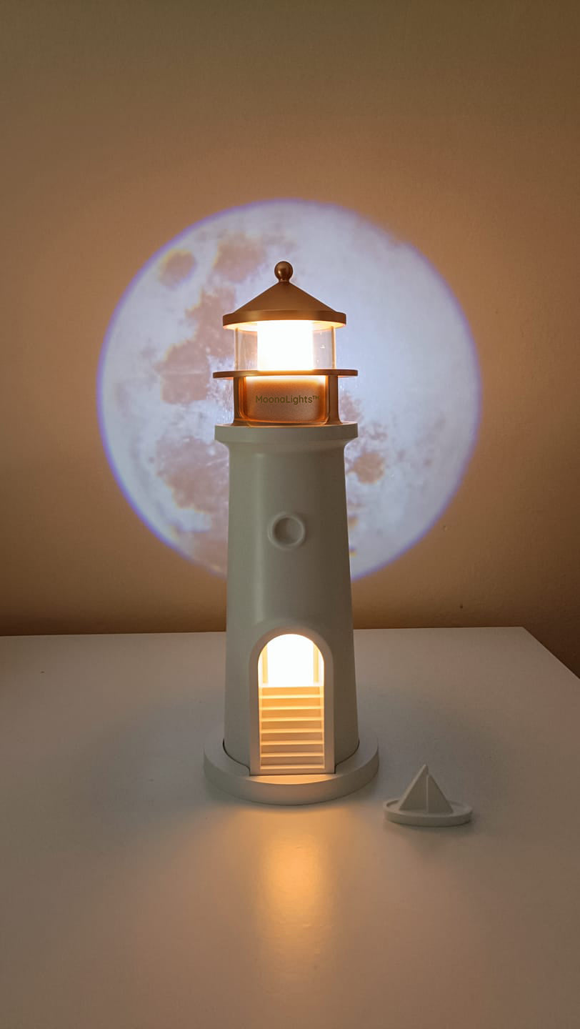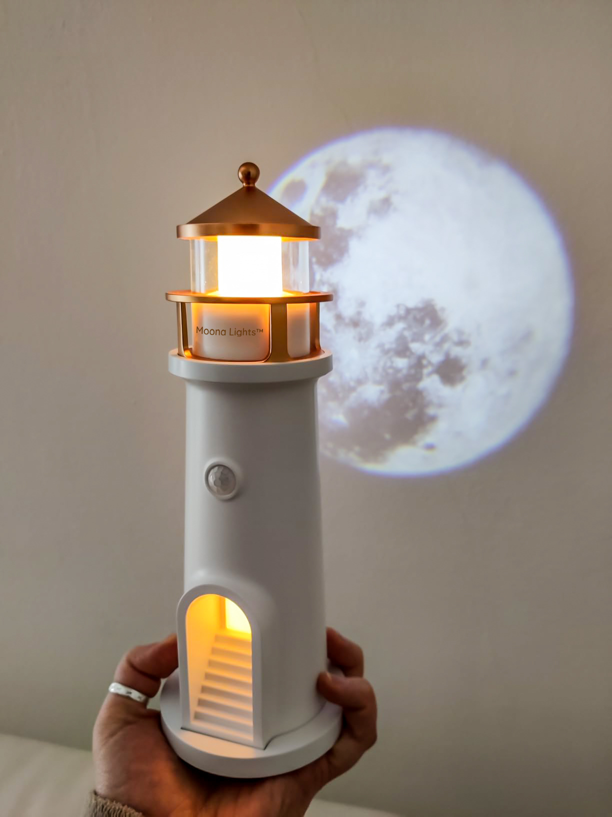 Inside, you’ll find the Lighthouse Moon Projector, USB-C charging, a decorative stand, a small sailboat, a clear guide, and a remote. Everything is designed to create a cozy, magical moonlight experience in your room.